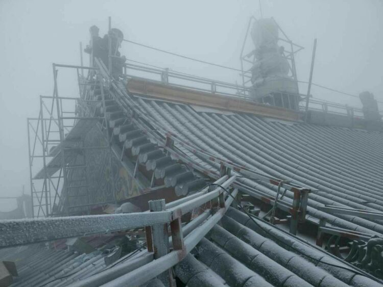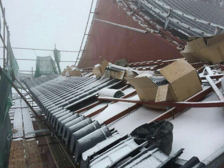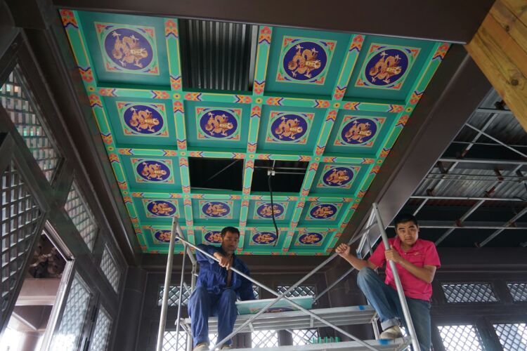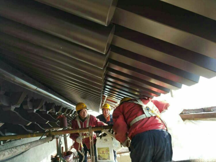 鋁斗拱及望板椽子安裝,全部在工廠加工好,現(xiàn)場組裝。