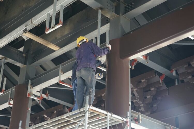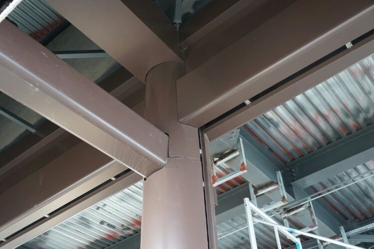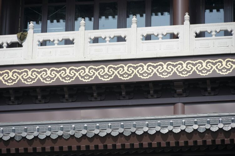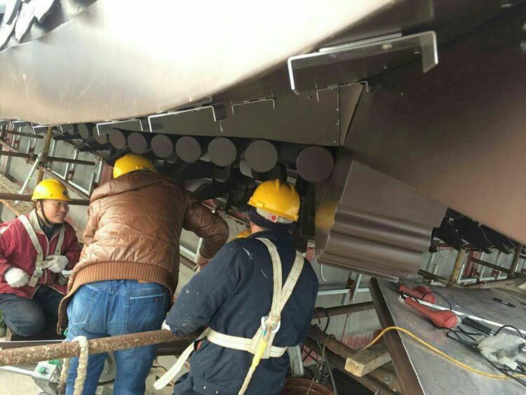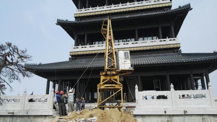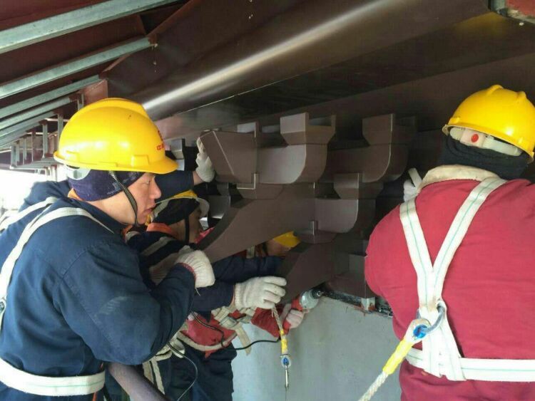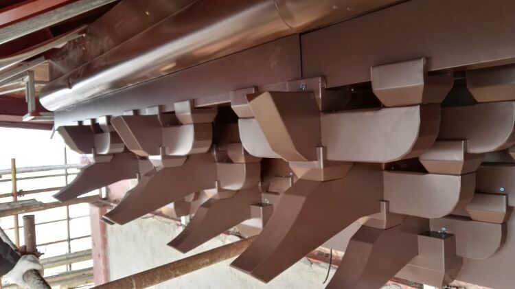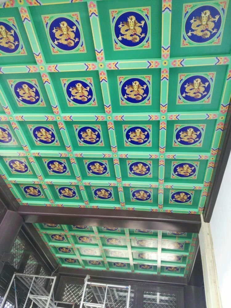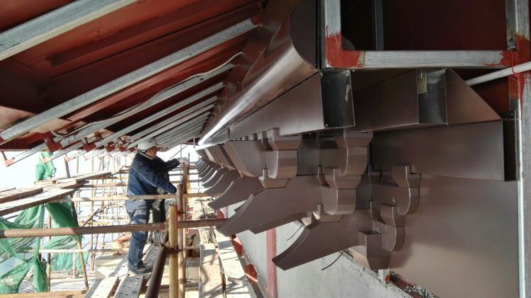鋁板包柱及額枋安裝,用鋁板在工廠加工好,用現(xiàn)代幕墻施工技術(shù)安裝,每個(gè)柱枋按古建模數(shù)要分解成加工圖紙,確保同現(xiàn)場一致。