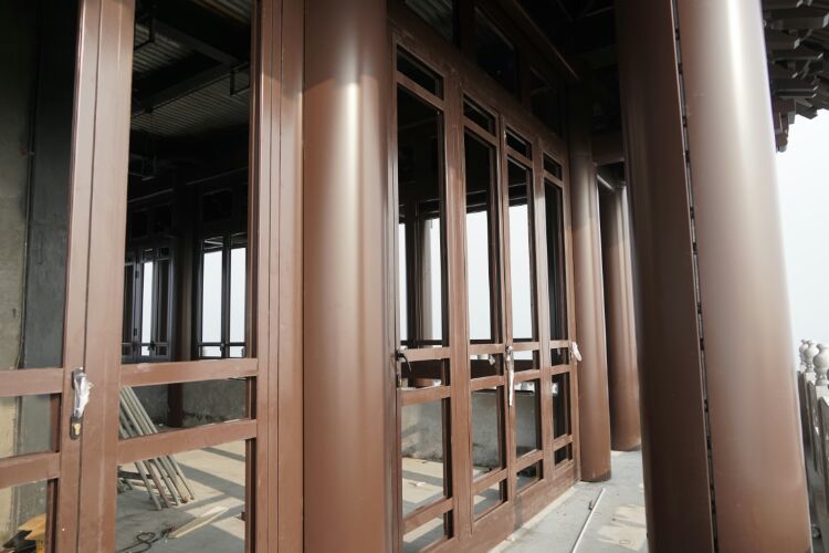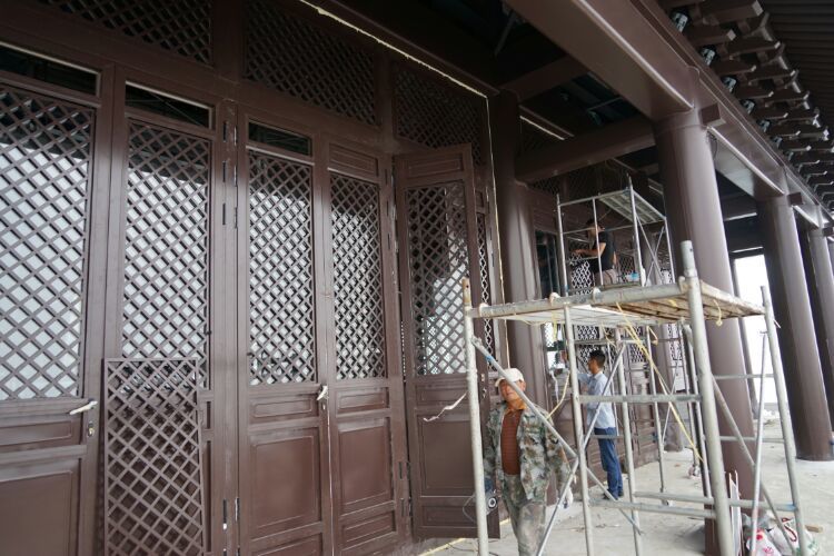 鋁合金門窗安裝,用鋁合金門窗型材做4米多高的門窗,中空玻璃,花格也是用鋁合金開榫組合而成,解決了傳統(tǒng)木門窗容易變形開裂,及密封不嚴(yán)等問題