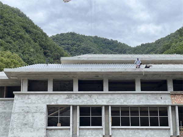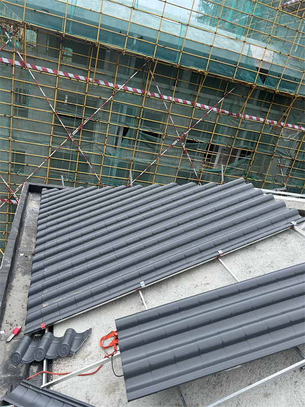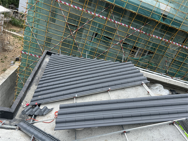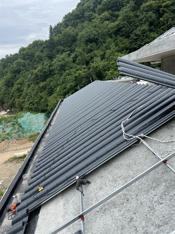 柞水龍盤研發中心綜合樓屋面選用3號連體金屬瓦,厚度為1.0mm,面積約2600平方;顏色為灰色,風格為新中式仿古風格,唐代風格。項目正在施工中,現將施工現場圖給大家做分享: