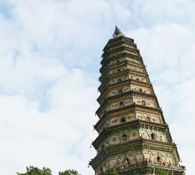 塔的形式為平面八角十三層樓閣式,通高47.31米,自下而上逐層收縮,塔檐幾乎可以連成一條直線,形如錐體。由于其塔身五彩斑斕如雨后彩虹,故名“飛虹塔”。飛虹塔是五座佛祖舍利塔和中國現存四座古塔之一,也是迄今為止發現的唯一留有工匠題款、最大最完整的琉璃塔。