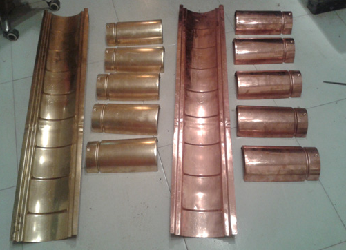 生產方式很簡單,技術也很初級,大家可以看到非常簡單的設計;特別是筒瓦的設計也是靠一個一個打螺絲打上去的連接方式;這個是銅瓦的樣品。整體的瓦當滴水也是沖壓成型的。