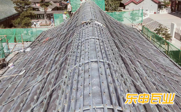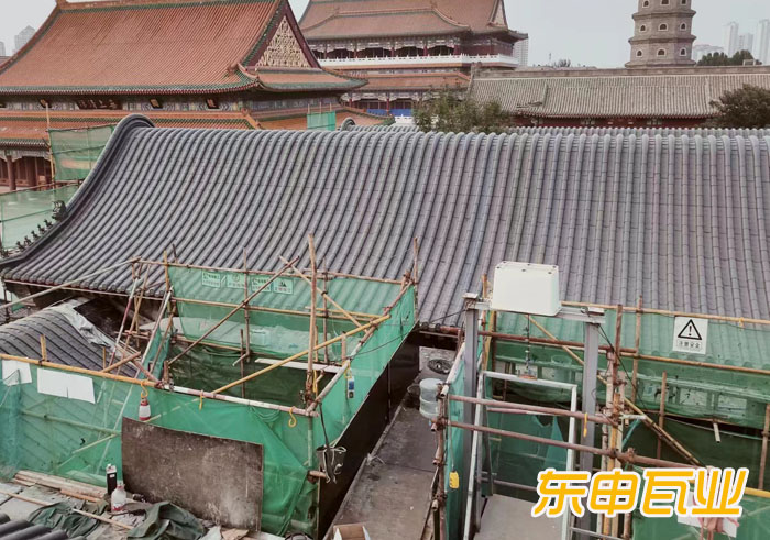 天津大悲院屋面仿古瓦鋁瓦施工完成歷時三個月,選用東申瓦業的3號分體鋁瓦,厚度1.2mm;顏色為灰色;風格為明清風格;整體屋面為卷棚屋面,用鋁瓦安裝外表面呈現滿滿的金屬質感,工藝精致,施工精心;非常感謝大悲院領導對我公司的信任和支持;寺廟用瓦,就選東申鋁瓦。