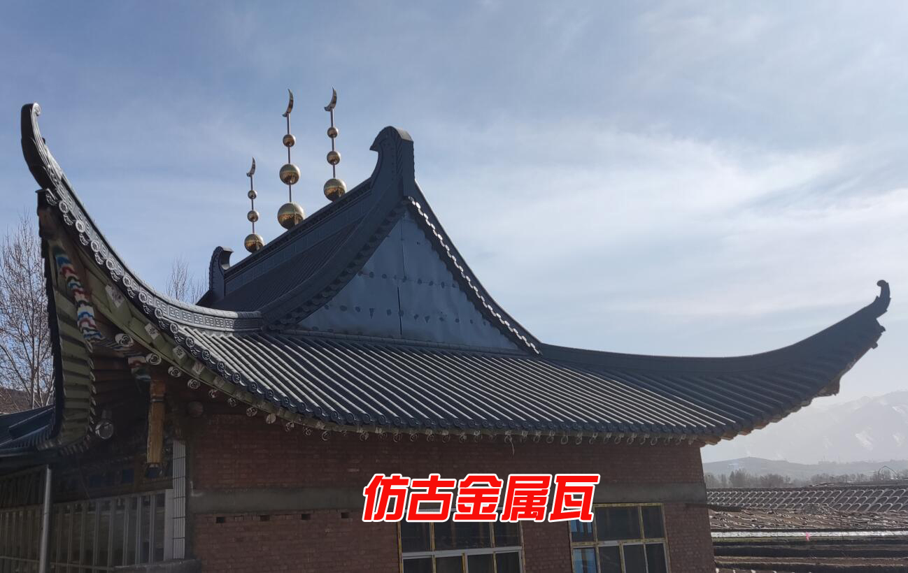 復古仿古金屬瓦是由凸起來的一塊瓦和凹下去的一塊瓦組成;凸起來的瓦叫筒瓦,就像一個半圓形彎曲能大一點;凹下去的一塊叫板瓦,這個彎曲小;整個屋面屋面就是由板瓦和筒瓦相接而成,一個塊筒瓦連接一塊板瓦,然后在一個筒瓦連接一塊板瓦。