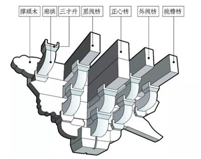 其次,是了解斗拱各部分的名稱。斗拱的主要構(gòu)件有拱、翹、昂、升和斗。