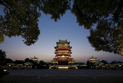 打亮坡屋面,同時(shí)照亮屋身的柱或墻,也是表達(dá)中國傳統(tǒng)建筑照明的一種方式。但采用相結(jié)合的照明,容易出現(xiàn)各部分均等照明或建筑所有部分都很亮的情況,因此,要注重建筑照明的明暗關(guān)系。