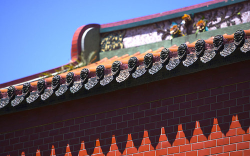 垂脊分獸前和獸后兩部分,獸前占坡長的1/3。垂獸放在分界處,安裝翹角攛頭,挑出的尺寸必須按規(guī)定。翹角之上放方眼勾頭,勾孔中釘鐵釬,安放仙人之后裝小獸c小獸的數(shù)目按設(shè)計規(guī)定,一般順序為龍、鳳、獅子、天馬、海馬、狻猊等l0件。
